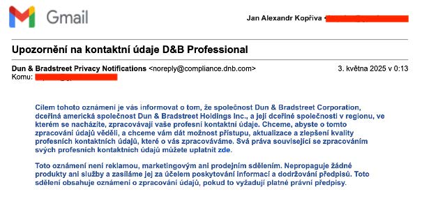 Obrázek 1: E-mail oznamující zpracování osobních dat v databázi společnosti Dun & Bradstreet