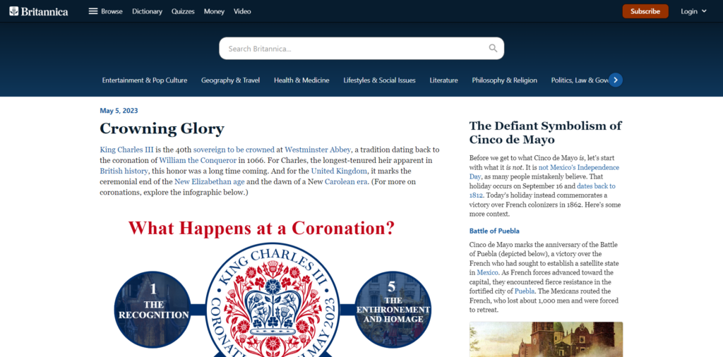 Stránka je volně dostupná z https://www.britannica.com/. Při vstupu na domovskou stránku se zobrazí úvod, ve kterém se prezentují nejrůznější témata a aktuální informace, které by mohly návštěvníka zajímat. Header stránky obsahuje slovník, kvízy, peníze a video a pod možností prohlížet ještě další. Následuje vyhledávací pole, do kterého lze zadávat klíčová slova autory či přímo názvy článků. O něco níže následují vybrané kategorie: zábava a popkultura, geografie a cestování, zdraví a medicína, sociální témata a život, literatura, filosofie a náboženství, politika, právo a vláda, věda, sport a volný čas, technologie, umění a jako poslední světová historie. Po headeru začíná obsah stránky, kterým je aktualita, v tomto případě korunovace krále Karla III.