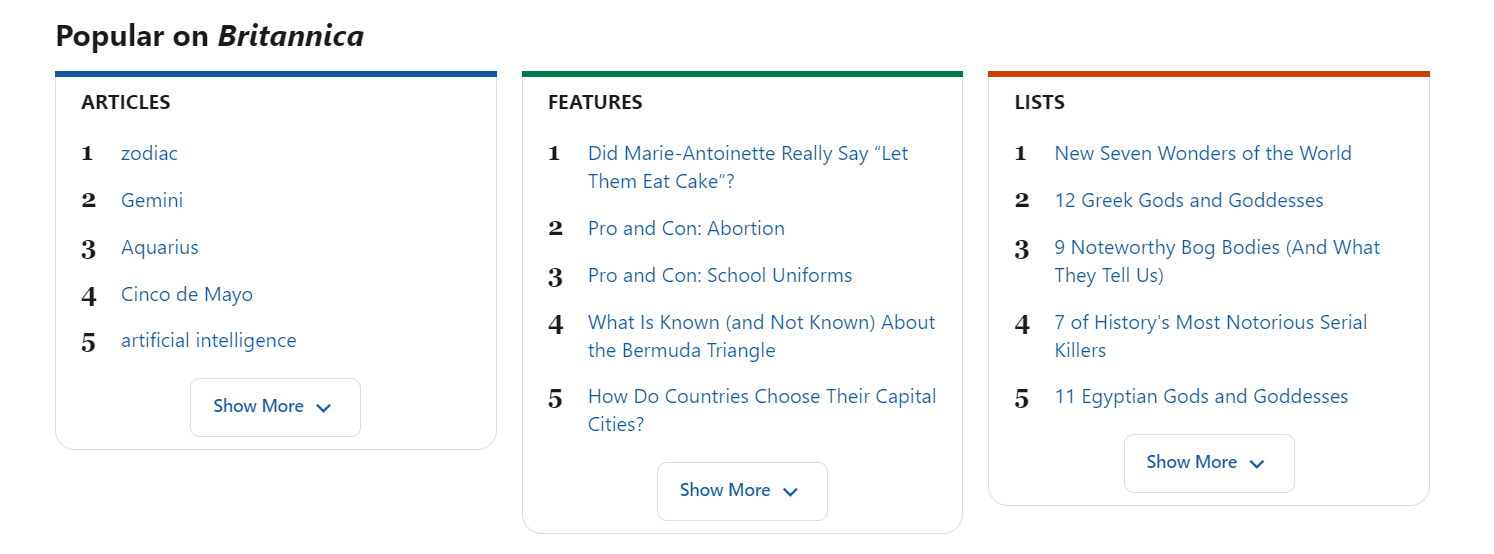 Po aktualitách následuje seznam populárních témat na Britannice.