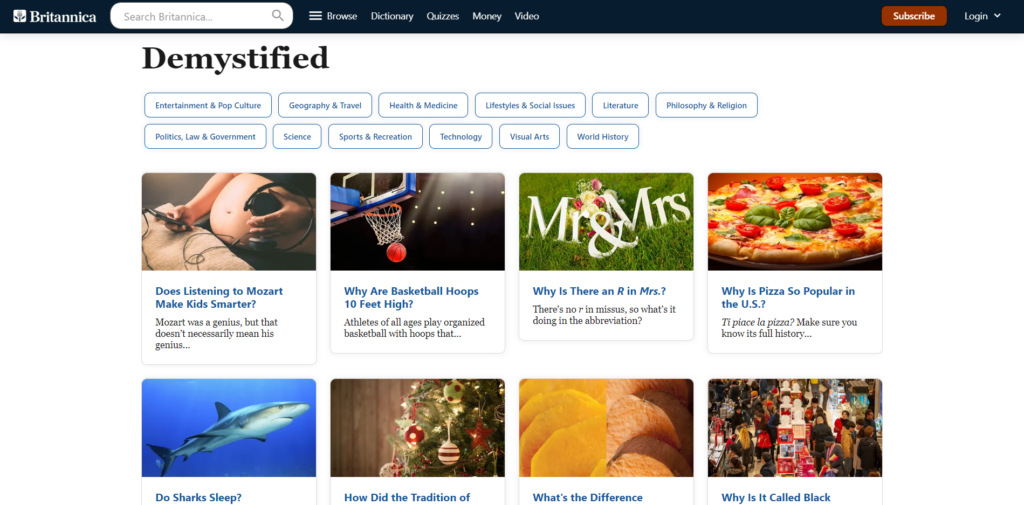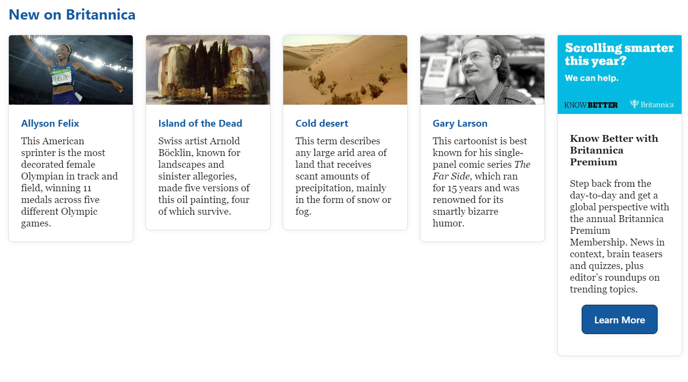 Osobně jsem primárně uživatel Wikipedie, která vždy uspokojila moji informační potřebu. Nicméně při psaní této práce jsem se rozhodl, že začnu hledat primárně na Britannice a nepochodím-li zde, zkusím ostatní zdroje. Encyklopedie je velmi přehledně členěna, na své kategorie, features a další. Nabídka kvízů, podcastů a audioverzí různých článků je něco, čím se může pyšnit jen málo stránek, které se zabývají informační činností. Dále standard erudovaného autora článků, čtivost, věcnost a fact-checking je něco, v čem má za mě Britannica monopol na kvalitu a důvěru, který si vydobyla svou stabilní několikasetletou kvalitou a tradicí. Dále sledování aktuálního dění ve světě, které autoři velmi dobře popisují, popřípadě glosují, umožňuje čtenáři substituovat encyklopedii za kvalitní noviny.