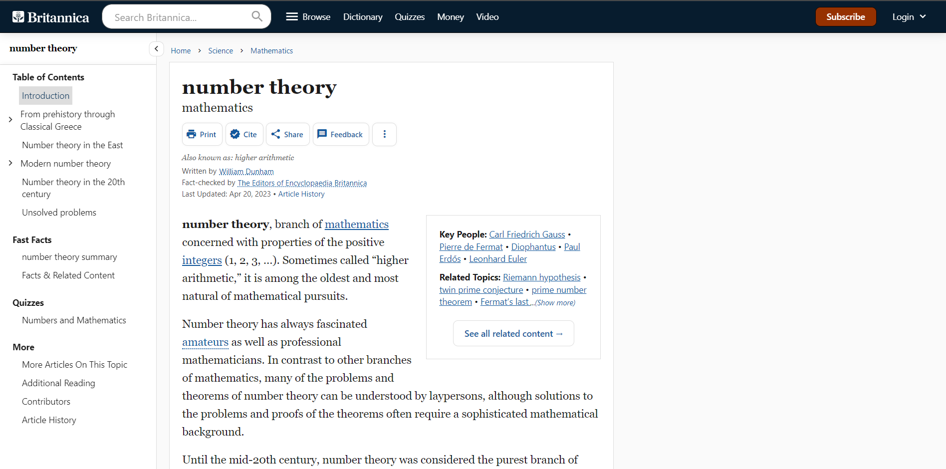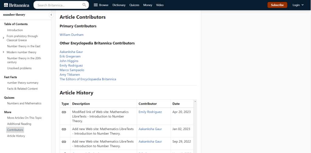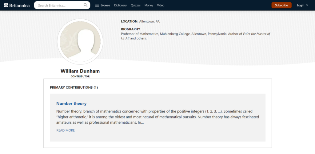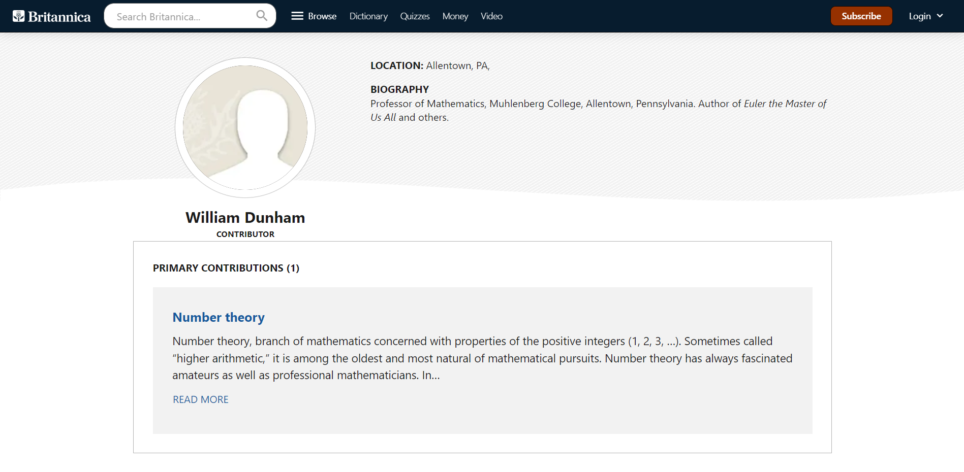 Patrně není hlavním přispěvatelem editorský tým Britannicy, ale pan William Dunham, nicméně je zde i seznam sekundárních přispěvatelů. Chci se o panu Dunhamovi dozvědět více, a tak si rozkliknu jeho jméno.
