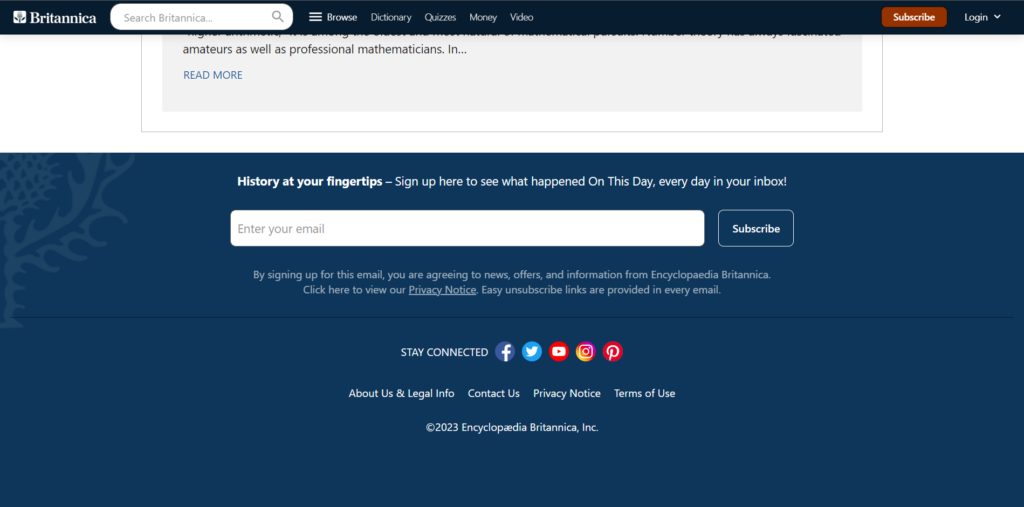 Ve footeru stránky si uživatel může do textového pole zadat svůj email, na který mu budou chodit novinky, nabídky a informace, které Encyclopædia Britannica zasílá svým odběratelům. Je zde i umístěn seznam sociálních sítích, na kterých encyklopedie působí a to na: Facebooku, Twitteru, Youtube, Instagramu a Pinterestu.