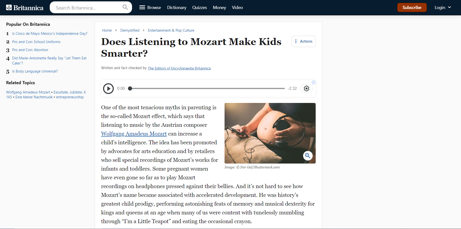 Rubriku jde očividně členit podle již zmíněných nastavených kategorií jako jsou věda apod. Rubrika sama o sobě nabízí několik článků, které zaujmou návštěvníka encyklopedie relativně jednoduše, neboť se domnívám, že alespoň o jednom nabízeném tématu již člověk slyšel. V mém případě diskuse o tom, zda poslech klasické hudby pro prenatální dítě zvyšuje jeho inteligenci. Na tento článek se podívám.