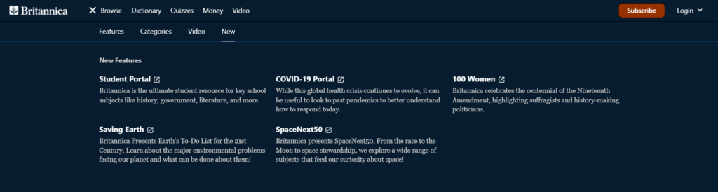 Britannica, krom Features, o kterých jsme se o odstavec výše bavili, prezentuje i New Features, ve kterých má například Student Portal nebo Covid-19 portal, které poskytují stálé relevantní a informace na tato témata. Zejména Student Portal, který funguje jako zdroj legitiminích citovatelných informací pro účely různých akademických prací.