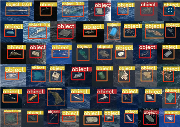 Figure 3: Typical detections by the algorithm. Several verified objects after manual sorting and elimination of duplicates (source: https://theoceancleanup.com/updates/using-artificial-intelligence-to-monitor-plastic-density-in-the-ocean/)