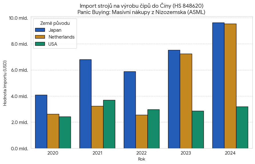 - Nizozemsko: Zde je vidět anomálie. V roce 2023 a 2024 import z Nizozemska explodoval na více než 6 miliard USD (nárůst o 380 % oproti roku 2020).