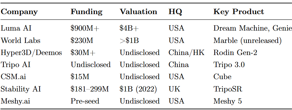 World Labs, CSM.ai), China (Hyper3D, Tripo AI), and the United Kingdom (Sta-
